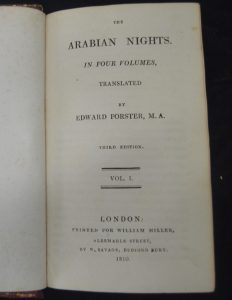 THE ARABIAN NIGHTS, in four volumes, translated by Edward Forster. Third Édition. London, William Miller 1810.
