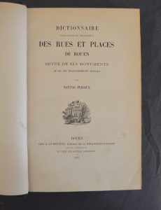 Rouen, Le Brument 1870. In 8° demi chagrin vert, xxi, 693 pp. Ouvrage incontournable pour la connaissance de la ville de Rouen, contenant de précieux renseignements historiques et étymologiques sur toutes les rues et les places. Bel exemplaire.
