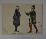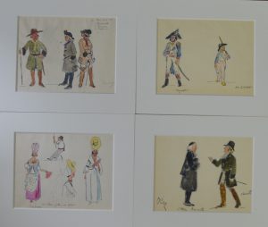 Ensemble de 15 dessins originaux representant des personnages du roman de Bernard Roy « Fanny ou l'esprit du large « . Ensemble de 15 dessins bien exécutés à l'aquarelle représentant des personnages en costume, réalisés en préparation d'une representation au théatre de “Fanny ou l'esprit du large”. Sont représentés : Charette, l'Abbé Bucaille, des matelots, Fanny, Mr de Bellenfant, des “ Frères de la côte “, Mme de Bellenfant, Jacquette, un nègre … etc.