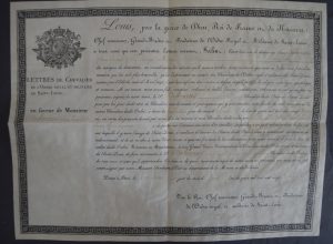 Lettres de chevalier de l'ordre royal et militaire de Saint-Louis, pour Mr Jean-Jacques Desbrosses, daté du 30 juin 1821. 1 ff. In folio, plein parchemin signé Louis, contresigné par le Baron Portalis. Bon état, manque le sceau.