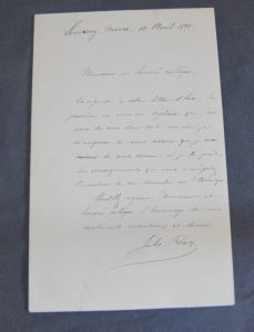 L.A.S. In 12°, 1 ff. Datée du 10 avril 1890. Dans laquelle il dit qu'il sera heureux de fournir à son correspondant tous les renseignements qu'il souhaite sur l'Amérique.