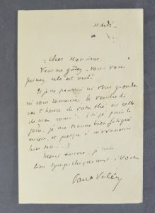 L.A.S. Mardi s.d. 1 pp. In 8° «  Cher Monsieur, vous me gatez, vous vous privez, cela est mal ! Et je ne pourrai ni vous gronder, ni vous remercier le vendredi car l'heure de votre thé est celle de mon cours ! ... »