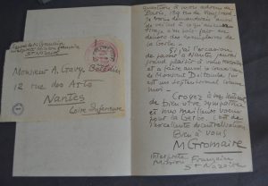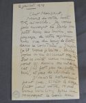 L.A.S. 2 ff. In 8° adréssée à Albert Gavy-Bélédin, datée du 2 juillet 1949. Dans laquelle il dit qu'il lui envoi de Paris, un petit bois au burin représentant une vue du bourg de Batz. Lettre provenant des archives d'Albert Gavy-Bélédin qui ont été confiées à la B.M., de Nantes (qui a apposée son tampon), ces archives ont été ensuite rendues à la famille.