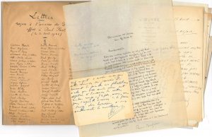 pour fêter sa réception dans la Légion d’honneur [nommé chevalier par décret du 15 janvier 1920, le Prince des Poètes fut reçu dans l’ordre le 9 avril 1920, par Alphonse Séché]. La plupart répondent à l’invitation d’Alphonse Séché, organisateur du banquet ; elles ont été remises à Paul Fort, qui les a classées sous 2 chemises autographes.