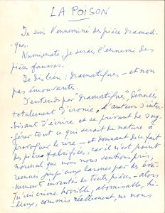 Sacha GUITRY (1885-1957). Manuscrit autographe signé, La Poison, [1951] ; 3 pages in-4. Article sur son film La Poison, publié dans L’Aurore du 26 novembre 1951. Il n’a pas voulu faire une œuvre dramatique, c’est-à-dire dénuée...
