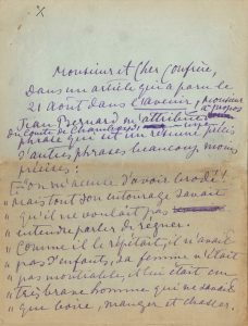 Sibylle-Gabrielle-Marie-Antoinette de MIRABEAU-MARTEL, dite GYP. L.A.S. « Gyp », à un « cher confrère » ; 10 pages in-4 à l’encre violette. Au sujet du Comte de Chambord, en réponse à un article de Jean Bernard, paru le 21 août...