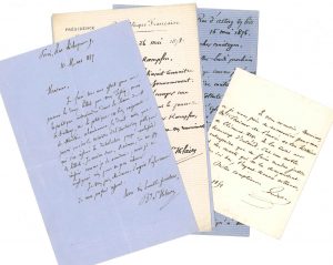 HISTORIENS. •27 lettres ou pièces, la plupart L.A.S. Jules Barthélemy-Saint-Hilaire (4, 1857-1875, parlant notamment de Thiers), Victor Cousin, Alfred-Auguste Cuvillier-Fleury (3), Léopold Delisle (à Étienne Charavay sur l’authenticité...