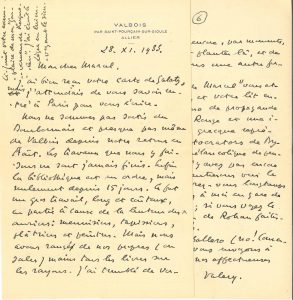 Valery LARBAUD (1881-1957). L.A.S. « Valery », Valbois (Allier) 28 novembre 1933, à Marcel Ray ; 6 pages in-8 à son adresse. Belle lettre à son ami le plus ancien et le plus intime. [Marcel Ray (1878-1951) fut professeur d’allemand,...