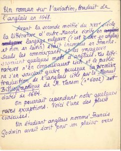 Pierre LOUÿS. Manuscrit autographe, Un roman sur l’aviation, traduit de l’anglais en 1648 ; 3 pages et demie in-4. Note d’érudition bibliographique, au sujet de la première traDuction de l’anglais en français que Lanson date de...