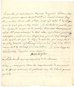Très belle lettre. [Montesquieu, devenu presque aveugle à la fin de sa vie, dictait ses lettres et ses œuvres ; il est émouvant de penser que cette lettre mélancolique était destinée à son amie aveugle comme lui.]