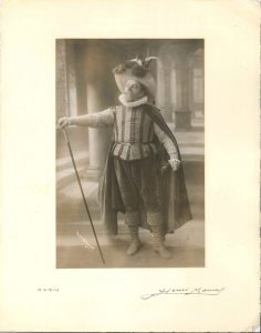 « à Aline Duval quelques amis dont Coq ». Belle photographie originale de Coquelin dans le rôle de Cyrano par Henri Manuel. 6 photographies des archives de sa famille : Coq sur son lit de mort, son tombeau, vues de sa chambre ou des pièces de réception. 3 photographies de sa chambre mortuaire sous une enveloppe au nom d’A. Chabert.