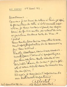 Alfred CORTOT (1877-1962). L.A.S., 14 novembre 1942, à une galeriste ; 1 page in-4 à son en-tête (petites fentes réparées). Achat de deux toiles de son fils, le tout jeune peintre Jean Cortot, né en 1925. Il envoie un chèque pour...