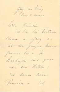 Frederick DELIUS (1862-1934) - Compositeur anglais. L.A.S., Grez-sur-Loing (Seine-et-Marne), à une amie ; 2 pages et demie in-8 ; En allemand. Il est près de Fontainebleau, à Grez, où il a passé tout l’été. Il y a deux ou trois...