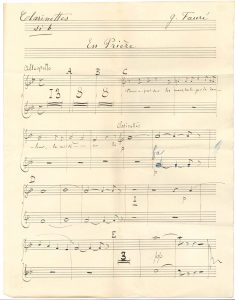 Gabriel FAURÉ. Manuscrit musical autographe signé, En prière ; 1 page in-fol. Partie de clarinettes pour la version pour petit orchestre du cantique pour voix et piano ou orgue, En prière, sur un poème de Stéphan Bordèse (première...