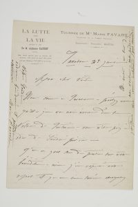 Tarascon 23 janvier [1890], pendant sa tournée de La Lutte pour la vie d’Alphonse Daudet (en-tête de La Lutte pour la vie de M. Alphonse Daudet, Tournée de Mme Marie Favart), [à Alphonse Daudet] :