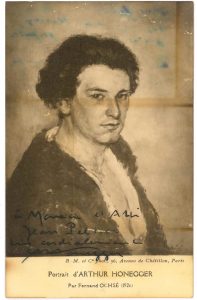 Arthur HONEGGER (1892-1955). Portrait avec dédicace a.s. ; carte postale illustrée (report d’encre délavée). Carte postale représentant le portrait d’Honegger par Fernand Ochsé (1920), dédicacée « à Monsieur l’Abbé Jean...