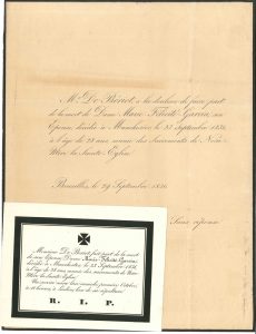 [Maria MALIBRAN (1808-1836)]. 3 documents (portrait gravé joint). Faire-part de son décès, daté Bruxelles 29 septembre 1836 (in-4). Carton de faire-part avec avis d’un service le 1er octobre, à Laeken, lieu de sa sépulture (carte gravée...