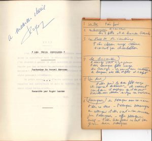 soir aux Funambules, à la Comédie des Champs-Élysées (Roger Lauran était directeur de la scène) le 29 mars 1953 : découpage, décors, éclairages, costumes et accessoires… ; et rédaction de premier jet du scénario de la pantomime et ses 27 tableaux.