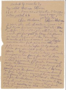 Il lui demande si elle a écrit une nouvelle œuvre pour orgue : « Surtout ne laissez pas tomber la composition, vous pouvez faire tant de choses intéressantes !... Pour moi, ma vie d’ouvrier-soldat se poursuit, fatigante et curieusement variée. Malheureusement, je n’ai pas le temps de lire un peu de musique comme je le voudrais, et les travaux manuels que je dois fournir sont souvent au-dessus de mes forces ». Il sait qu’elle a des nouvelles de sa femme et de son petit Pascal : « Prions tous pour la Paix, à laquelle je continue de croire, pour un temps proche »…
