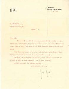 Maurice RAVEL (1875-1937). L.S., Le Belvédère, Montfort l’Amaury 8 août 1924, à G. Jean-Aubry, à Londres ; 1 page in-4 à son chiffre, dactylographiée à l’encre rouge, enveloppe. « Êtes-vous à Londres ? Si vous vous trouvez...