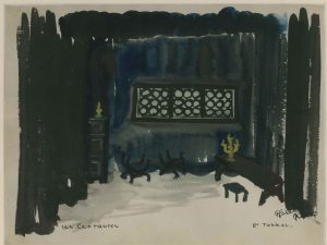 THÉATRE. 4 maquettes originales de décors ou costumes, gouaches, de la collection de Roger Lauran, encadrées François Galliard-Risler, décor pour Les Centaures de Max Campserveux (Athénée 1957 ; signé, 24 x 31,5 cm). J. Hodger, costume...