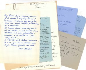 THÉATRE. 20 lettres ou pièces, la plupart L.A.S. adressées à Roger Lauran, Claude Sainval ou Raymond Rouleau, à la Comédie des Champs-Élysées. Jean Amadou (texte sur Roger Pierre), Jean Anouilh, Radifé Harry Baur, André Boll, Suzanne...