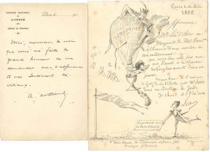 THÉATRE ET SPECTACLE. 22 lettres ou pièces, la plupart L.A.S., XIXe-XXe siècle. Léa d’Asco (invitation lithographiée illustrée pour son enlèvement en ballon, 1882), André Antoine, Jean Bastia (ensemble de tapuscrits pour 100 p. 100...