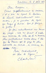 Charles TRENET (1913-2001). L.A.S., Narbonne 8 août 1953, à Paul Carrière du Figaro ; 1 page in-8, au dos de la L.S. de Paul Carrière à en-tête du Figaro, enveloppe. Réponse à une enquête sur les vacances des vedettes. « Étant...