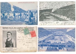 SPORT. Album d’environ 90 cartes postales illustrées, [début XXe siècle]. Cartes (avec ou sans messages) représentant le stade des Jeux Olympiques d’Athènes en 1906, des gymnastes, escrimeurs, boxeurs, patineurs artistiques, skieurs...