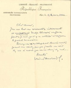 19 mars. Il prie lui renvoyer, si le Général [De Gaulle] n’en a plus besoin, les pages qu’il lui avait confiées : « Je désire les revoir avant de les envoyer à mon éditeur de Londres. […] je serais heureux de m’entretenir […] avec vous, […] vous dire combien nous nous félicitons d’être en complet accord avec le magnifique discours du Général : je crois que nous ne pourrions le dire plus nettement, plus simplement, ni le faire dire plus “purement”, en confiant ce soin à ce camarade si sincère et de si belle fraîcheur d’âme que Jean Berard »…