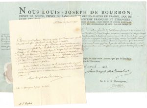 Louis-Joseph de Bourbon, Prince de CONDÉ. 2 P.S., Q.G. d’Überlingen ou de Feistritz 1797-1801 ; contresignées par son secrétaire des commandements Droüin ; 1 page oblong in-fol. chaque en partie impr., sceaux aux armes sous papier...