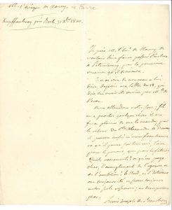 Kupffenberg près Bruk 31 décembre 1800, à l’évêque de Nancy [Mgr de La Fare, émigré à Vienne]. Il le prie de faire passer une lettre à Pétersbourg, et l’invite à lui écrire « franchement », par le retour du comte Alexandre de Damas, « ce qu’il pense sur tout ceci, tant pour le present, que pour le futur ; quels evenements ! et qu’on paye cher, l’aveuglement de l’egoïsme et de l’ambition ! Le Nord, et l’Intérieur ont toujours été, et seront toujours notre seule ressource ; ne desesperons pas »...