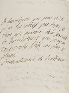 Elle vient d’apprendre la mort de l’Abbesse du Port-Royal, et signale, à Chelles, « une religieuse fille de tres bonne mésson qui s’apelle Me de Lenfi que j’ay beaucoup conu dans le temp que Me d’Orleans [l’Abbesse Adélaïde d’Orléans] éstoit à Chelle. Elle éstoit aimé et éstimé de toute la comunoté. Je mi enterrèce fort et prie vostre éminence de luy donér labbéye de Pore royalle. Je ne vous la demenderois pas pour elle si je ne l’en croyéy pas digne »…