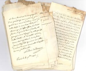 Famille de DAMAS-CRUX. Environ 100 lettres, la plupart L.A.S., 1810-1830, à l’avocat Jean-Baptiste Lesueur (fortes mouillures avec des manques dans le haut de certaines lettres). Correspondance d’affaires avec Jean-Baptiste Lesueur, avocat...