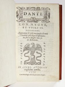 Dès le milieu du XVIe siècle, Jean de Tournes et son concurrent Guillaume Rouillé donnèrent des éditions maniables et de petit format des auteurs italiens. Bénéficiant de la demande d'un important lectorat italien, ils contribuèrent également à la diffusion et à l'apprentissage de la langue italienne, en France. Guillaume Rouillé (1545-1589), humaniste et libraire, donne ici le texte de la Divine comédie de Dante accompagné des annotations d'Alessandro Vellutello.