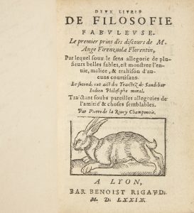 LARIVEY (Pierre de) - Deux livres de Filosofie Fabuleuse. Le premier prins des discours de M. Ange Firenzuola Florentin, Par lequel souz le sens allegoric de plusieurs belles fables, est monstrée l'envie, malice, & trahison d'aucuns courtisans. Le...
