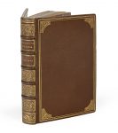 In-16 [117 x 78 mm] de 379 pp. (chiffrées par erreur 377) sans 2 ff. blancs à la fin : maroquin marron clair, encadrement sur les plats d'un triple filet doré avec fleurons stylisés et points aux angles, dos à nerfs orné de caissons et fleurons dorés, roulette intérieure, tranches dorées sur marbrure (Trautz-Bauzonnet).