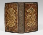 In-8 [172 x 110 mm] de 399 pp. (chiffrées par erreur 409) : veau brun, plats avec encadrement de deux listels or rehaussés à la cire blanche et brune, au centre grande plaque de style oriental formée de rinceaux stylisés en réserve rehaussés à la cire polychrome sur fond doré, champ entièrement couvert d'un semé de trois points dorés et filets courbes simples se développant autour du motif central avec fers azurés et évidés, filets sur les coupes, tranches dorées (reliure de l' époque).