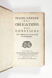 [RANCÉ (Armand Jean Le Bouthillier de)]. Traité abregé des Obligations des Chrétiens. Par l'Auteur des Livres de la Vie Monastique. A Paris, chez François Muguet, 1699. In-12 [162 x 93 mm] de (11) ff., 395 pp., (5) ff. : maroquin rouge, filet...
