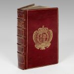 d'encadrement, armoiries dorées au centre, dos à nerfs orné d'un filet doré délimitant les caissons, roulette sur les coupes et intérieure, tranches dorées sur marbrure (reliure de l' époque).