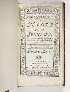 [RESTIF DE LA BRETONNE (Nicolas Edme)]. Le Marquis de T***, ou L'Ecole de la Jeunesse, Tirée des Mémoires recueillis par N.-E.-A. Desforets, homme-d'affaires de la Maison de T···. À Londres. Paris, chez Humblot, 1771. 4 volumes in-12 [167 x 95...