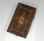 chardons dorés aux angles de l'encadrement extérieur, et lis dorés aux angles intérieurs, armoiries royales couronnées flanqués du chiffre “F” couronnés et emblème de la Salamandre au milieu du rectangle central délimité par un grand fleuron formé d'accolades portant un élément héraldique, à savoir des lis, et des fleurettes stylisées aux extrémités ; au premier plat flammes près de la Salamandre ; un point doré au même endroit au second plat avec lis et fers pleins feuillagés ; dos à six nerfs soulignés d'un filet doré, alternant dans les entrenerfs trois lis, deux “F” et une fleurette dorés, en tête et en pied du dos filets à froid et obliques, filet doré sur les coupes, tranches dorées, quatre rubans d'étoffe verte servant d'attaches (reliure de l' époque).