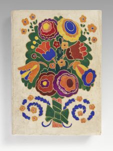 floral pyrogravé, peint et vernis, couvrant le premier plat, fleur de même sur le second plat, doublures et gardes de vélin, entièrement non rogné, couverture illustrée conservée (André Mare).