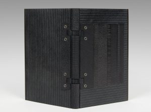 pièces d'ébène le tout riveté sur un du veau gaufré noir à lignes horizontales sur le premier plat, bande unique de veau noir gaufré sur le second plat, baguettes d'ébène en bord de gouttière des plats, doublures et gardes de veau gaufré noir, non rogné, couverture et dos conservés, chemise en demi-veau noir à rabats, étui (Jean de Gonet, 1985).