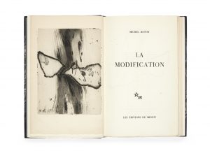 BUTOR (Michel). La Modification. Paris, Éditions de Minuit, 1957. In-8 [225 x 142 mm] de 236 pp., (2) ff. dont 1 blanc : demi-maroquin bleu nuit à coins, dos à nerfs, non rogné, tête dorée, couverture et dos conservés (reliure...