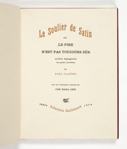 CLAUDEL (Paul). Le Soulier de satin, ou le Pire n'est pas toujours sûr. Action espagnole en quatre journées. Avec les frontispices composés par José Maria Sert. Paris, Librairie Gallimard, 1928-1929. 4 volumes in-4 [257 x 199 mm] de 132 pp., (1)...