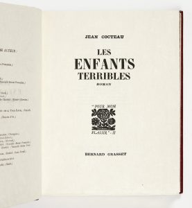 COCTEAU (Jean). Les Enfants terribles, roman. Paris, Grasset, 1929. In-4 [220 x 168 mm] de (2) ff., 228 pp., (2) ff. d'achevé d'imprimer et d'errata : maroquin bordeaux janséniste, dos à quatre nerfs, coupes filetées or, doublures et gardes de...