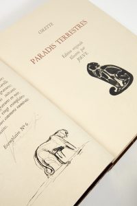 COLETTE. Paradis terrestres. Édition originale illustrée par Jouve. Lausanne, Gonin & cie, 1932. In-4 [307 x 257 mm] de (4) ff., 116 pp., (11) ff. : maroquin janséniste brun, dos à 4 nerfs, doublures de maroquin encadrées d'un triple filet...
