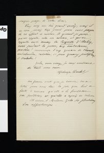 Ma femme veut que je rouvre ma lettre pour vous dire la joie que lui a faite le roman qu'elle a lu feuilleton par feuilleton et qu'elle a repris en volume. Elle envoie à Madame Zola ses félicitations bien affectueuses.”