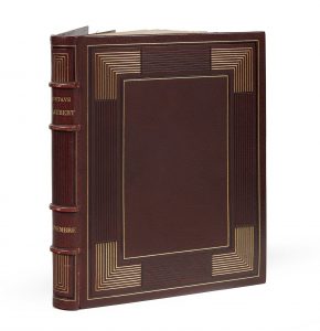 encadrement de filets dorés et à froid, bordures intérieures en maroquin de même teinte filetées or et à froid, cuivre enchâssé dans le premier contreplat, gardes de moire bordeaux, tranches dorées sur témoins, couverture et dos conservés, étui (G. Cretté succ. de Marius Michel).